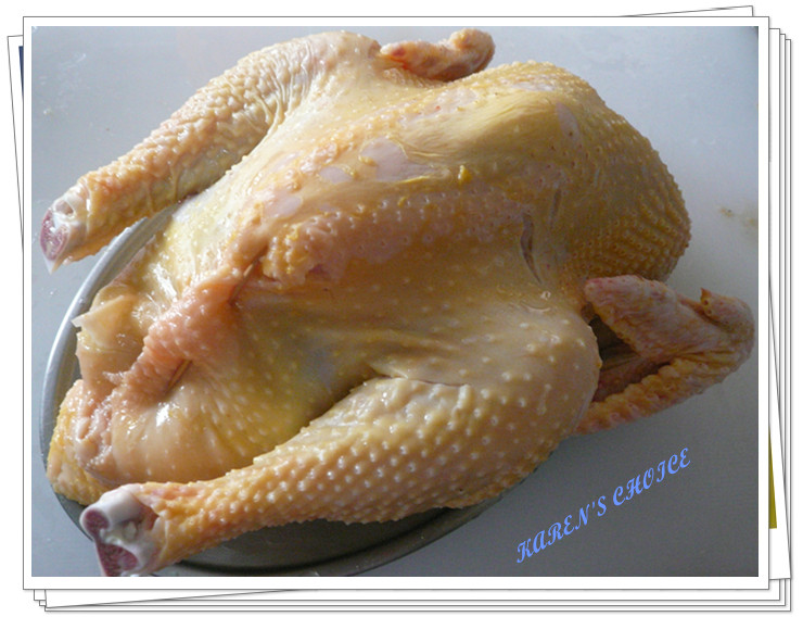 5. Bring in the whole clean chichen. Sprinkle salt all over the