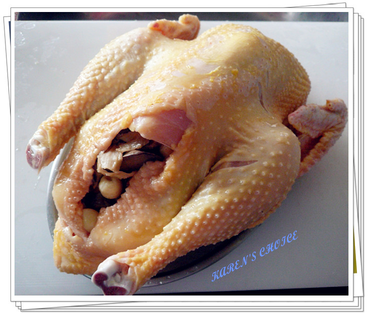 chicken, rub it inside & outside evenly. Then stuff all the