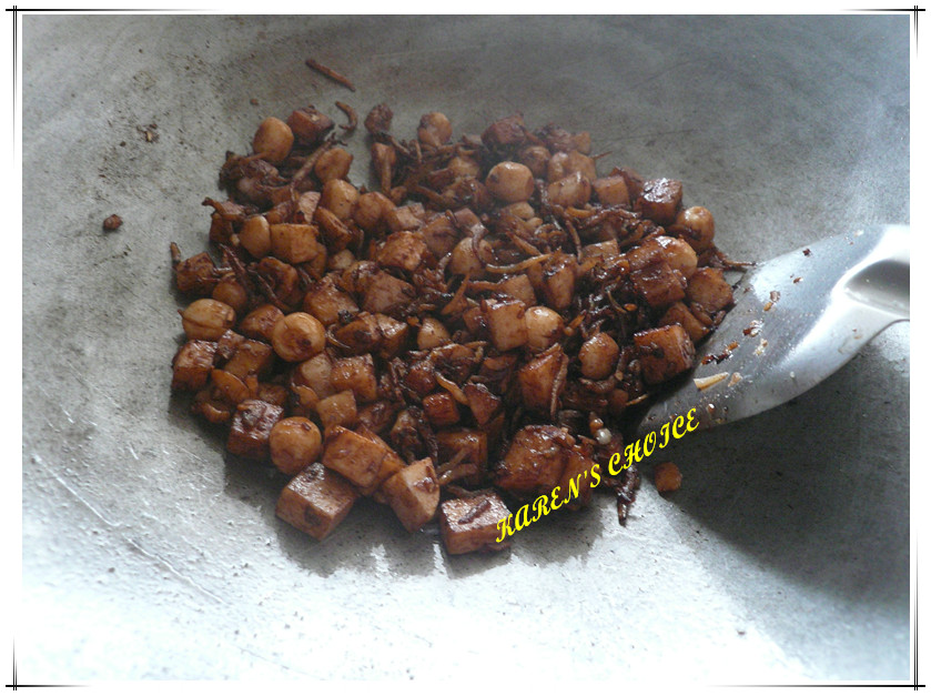 to stir fry, follow then the yam cubes and lotus seeds. Mix well.