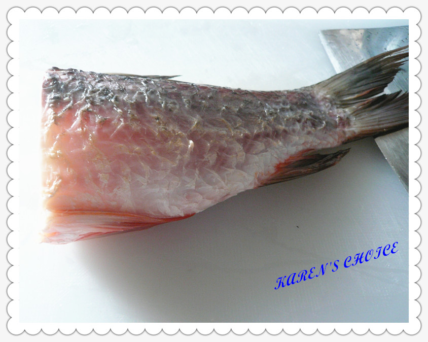 5. When fish tail is cooked, turn off heat. Take out the dish,